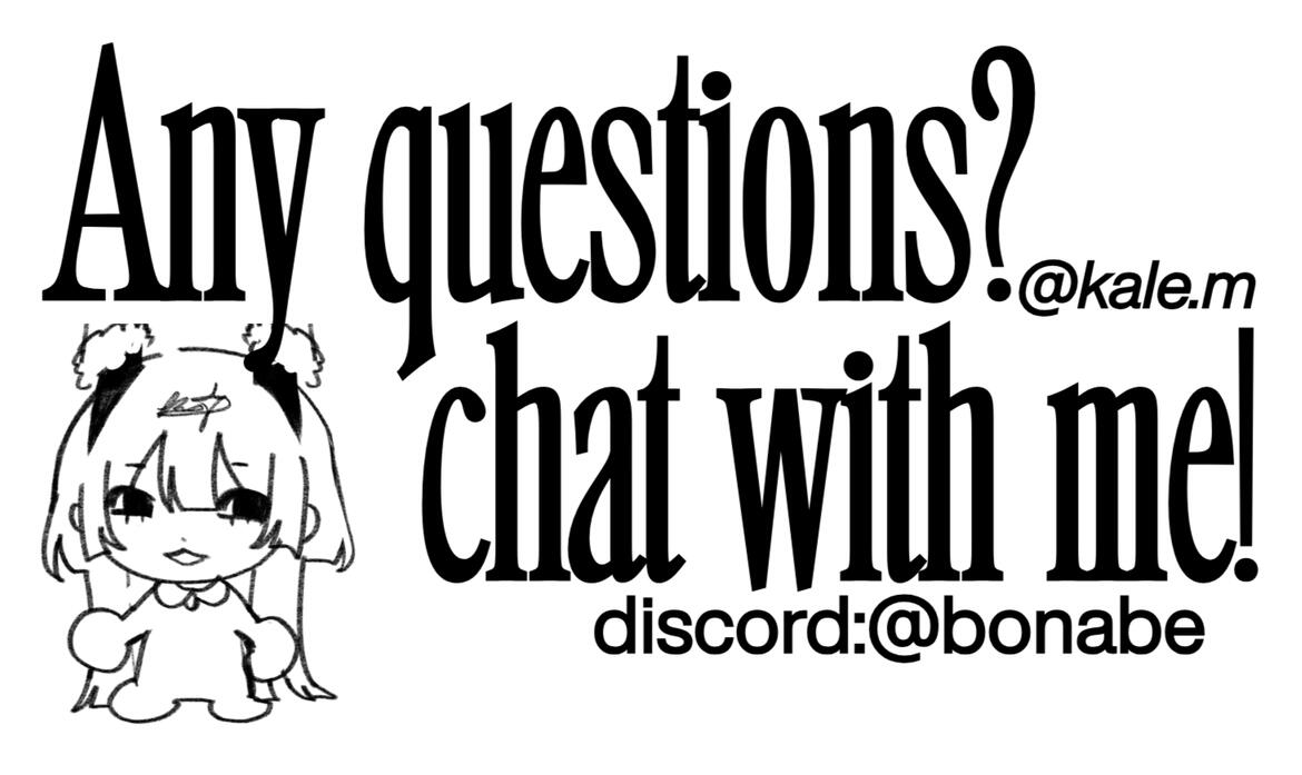 - if needed, please specify the size of the canvas and if it should be square + if you need a specific file size (i.e. for emotes or pfps) otherwise, i will use my program's default canvas size!_______